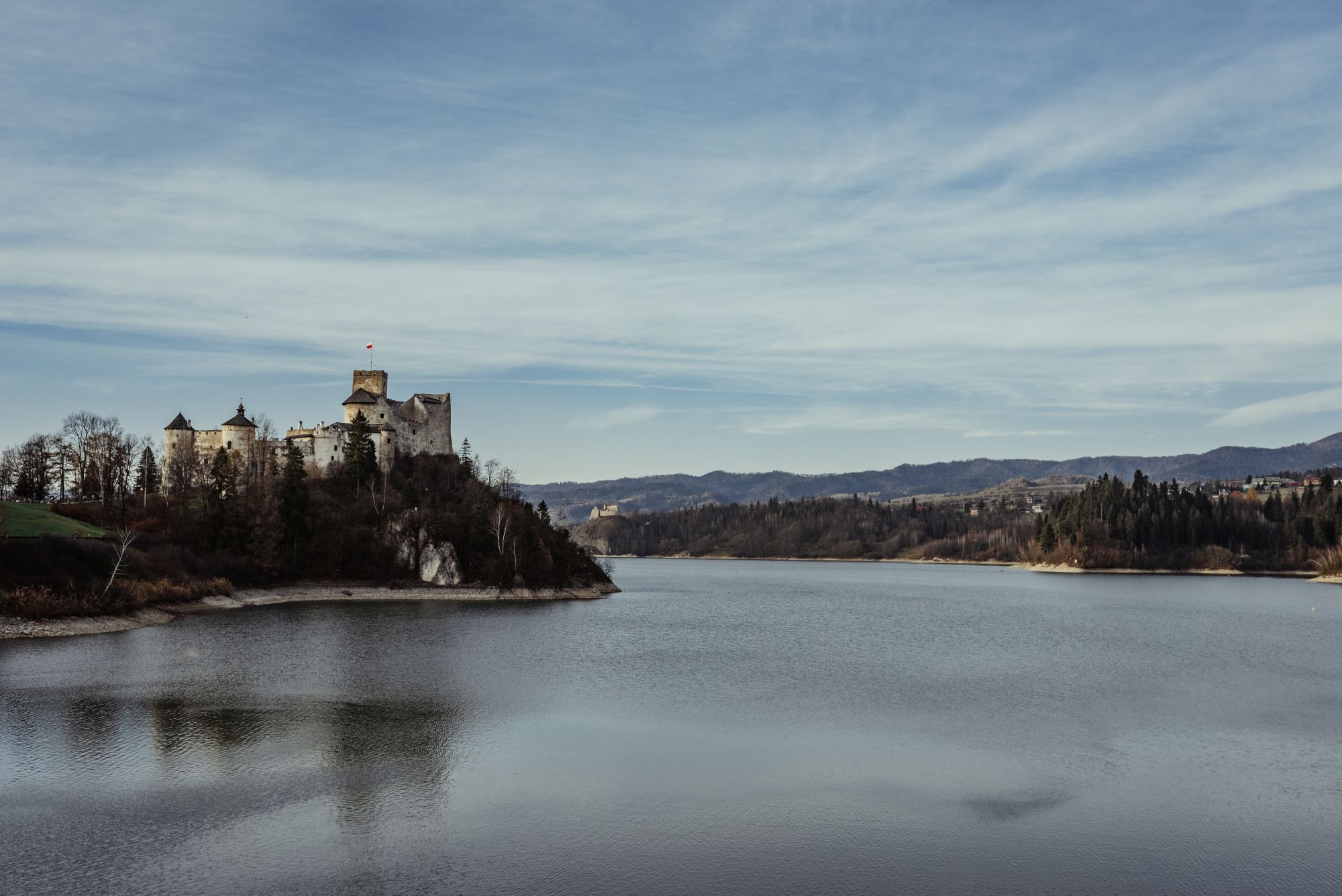 Widok na jezioro Czorsztyńskie – na lewym brzegu zamek w Niedzicy, na prawym widoczne ruiny zamku w Czorsztynie, fot. K. Schubert, MIK 2018 ©