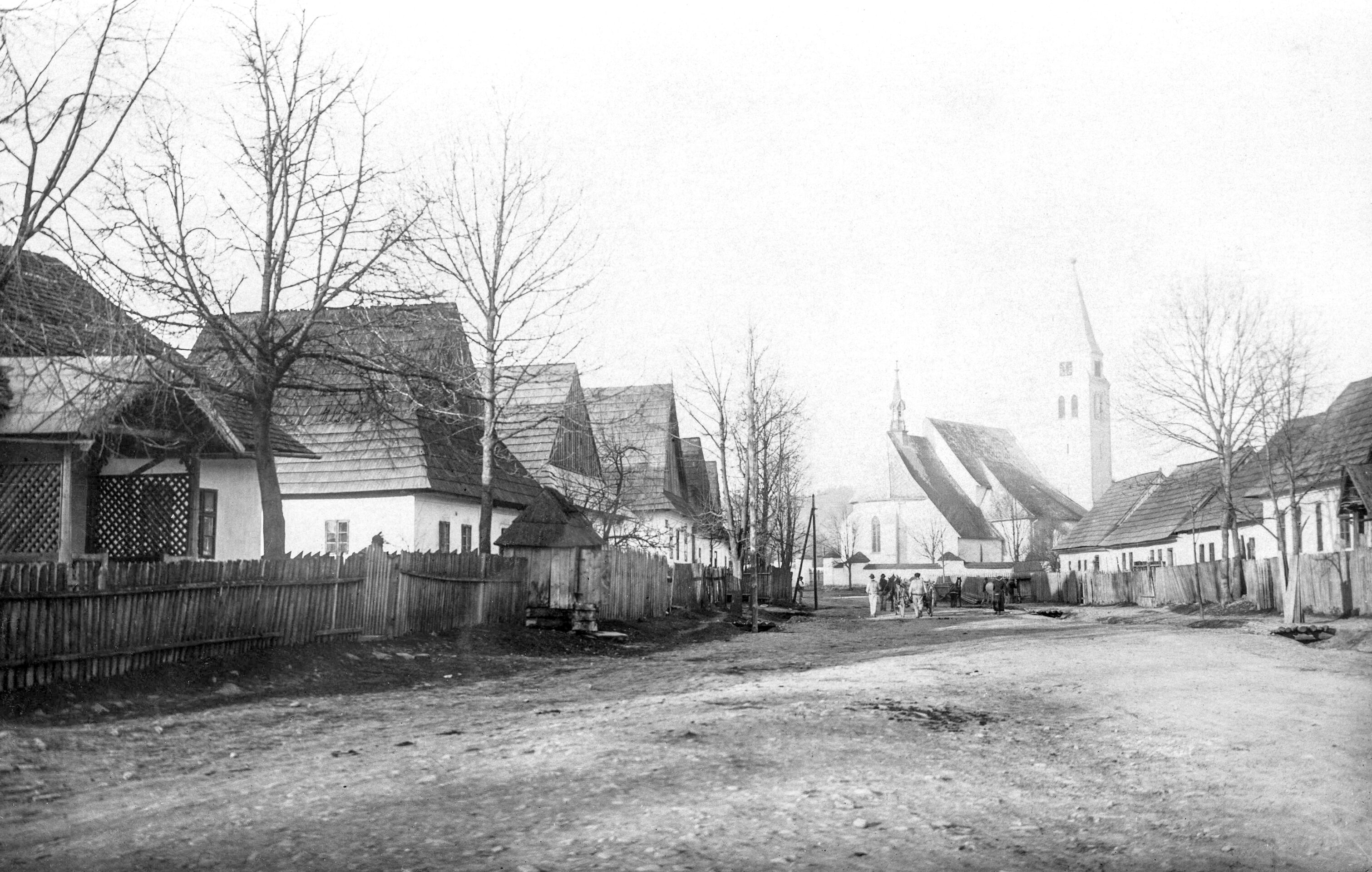 Główna droga w Niedzicy z kościołem pw. św. Bartłomieja w tle w okresie międzywojennym, fot. T. i S. Zwoliński. Narodowe Archiwum Cyfrowe ©