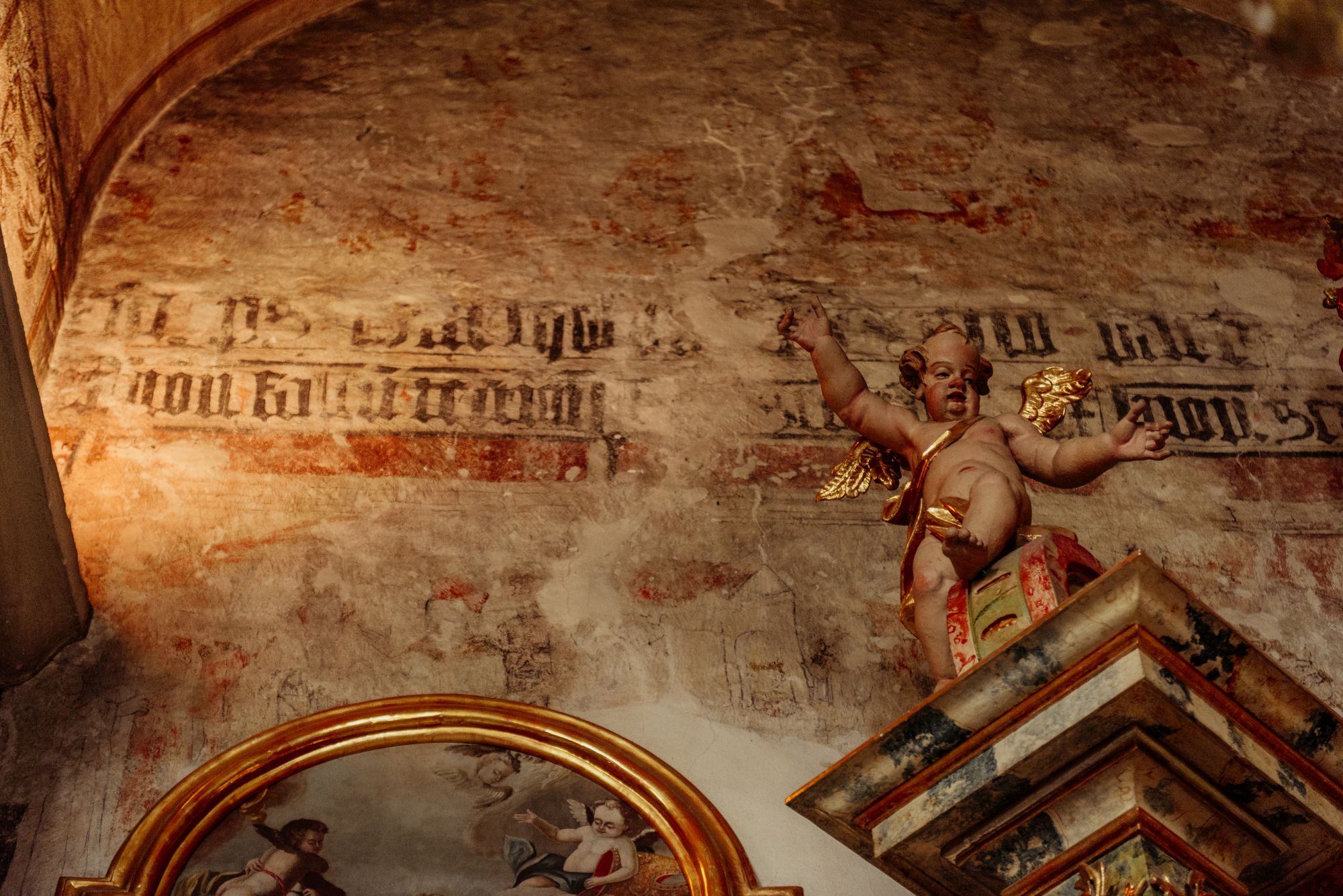 Inskrypcja na ścianie w prezbiterium oraz putto na ołtarzu bocznym w kościele pw. św. Bartłomieja w Niedzicy, fot. K. Schubert, MIK 2018 ©